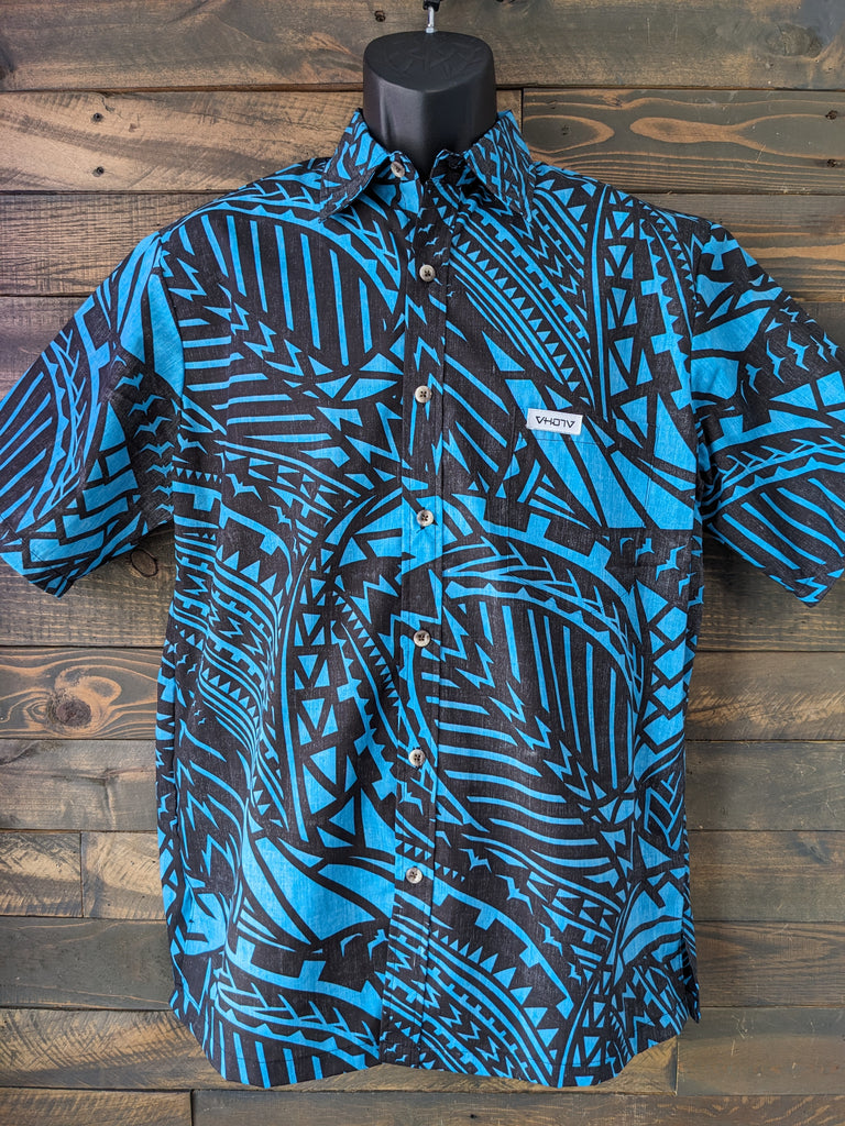 Black/Blue "Tribal" All Over Tapa design on a Button Down style Aloha Shirt in 65% Poly / 35% Cotton blend with a matching pattern pocket, straight hem with side vents/splits, back center box pleat, and is proudly made right here in Hawaii. Great for business, casual dinners, and more!