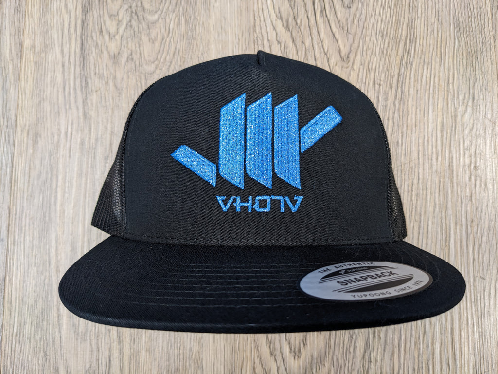 - 5-panel black cap with buckram front lining, classic mesh back, and quilted comfort sweatband, with Shaka Logo in eye-catching Blue Sparkle embroidery. 3 ½" crown, 8 rows of stitching on flat visor, with matching plastic adjustable strap. Material: 47% Cotton / 25% Polyester/ 28% Nylon.