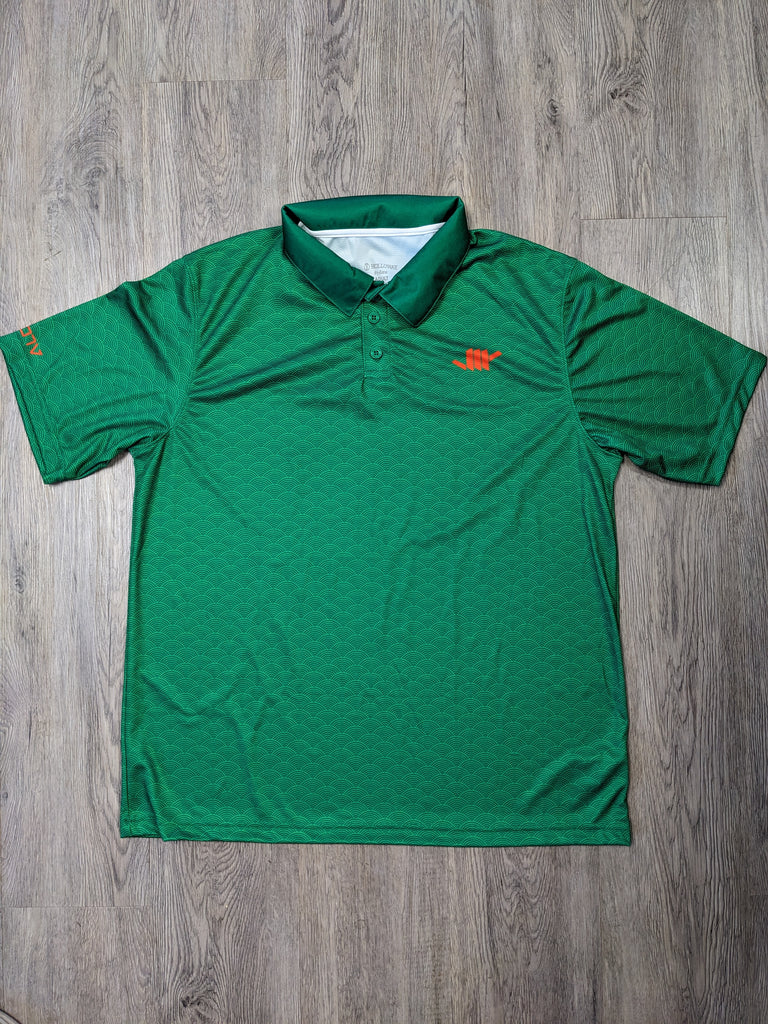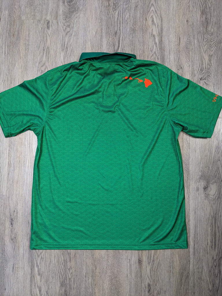 Kelly Green moisture wicking performance polo with full custom Seigaiha pattern sublimated into fabric. Includes mini Shaka on front left chest, Hawaiian Island chain on back right shoulder, and VH07V logo on right sleeve. 4.1 ounce, 100% polyester wicking horizontal textured stripe knit with 15+ UPF protection against the sun. Includes set-in sleeves for comfort, three matching buttons and a self-fabric collar that maintains its shape wear after wear. Perfect for golf, office attire or everyday wear.