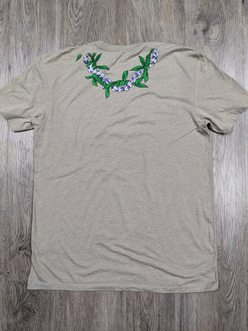 Purple Crown Flower & Ti Leaf "Lei" design printed around the neck on both front and back on a soft, Tan, 60% Cotton, 40% Polyester Heather Crew T-Shirt. Perfect for fans of Hula, Hawaiian Culture, plants, Hawaii and more! 4.3 oz,, 30 singles. Premium fabric, neck ribbing, side seamed, shoulder to shoulder tape, and double-needle hems. Also comes in Graphite.