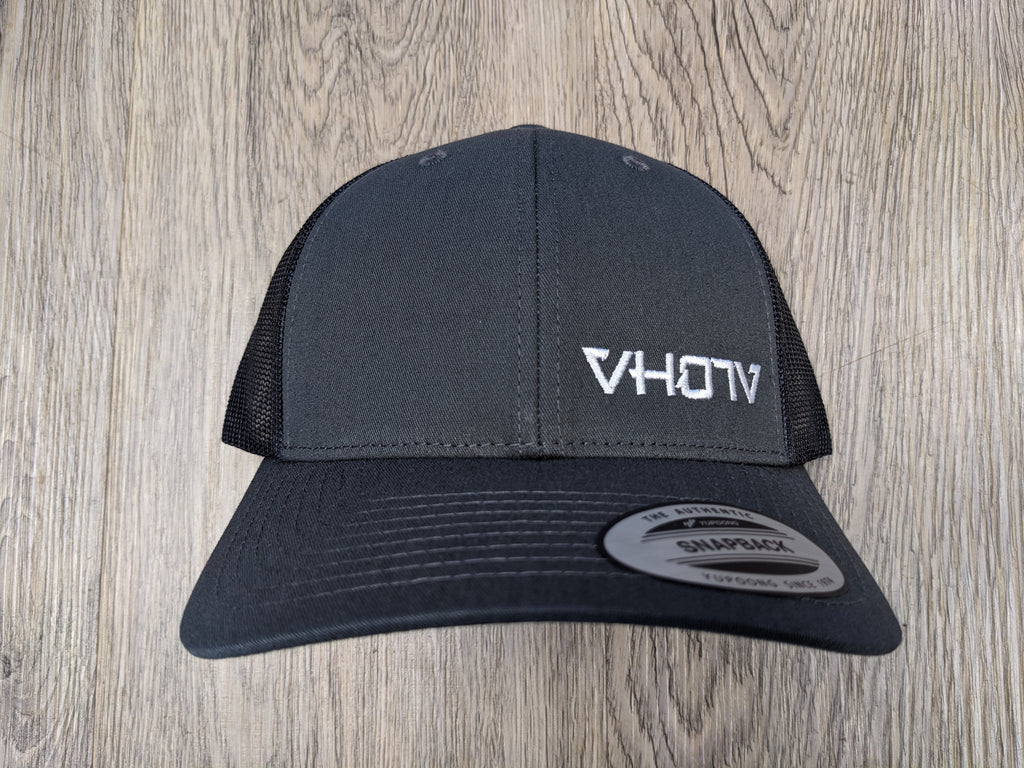 - Charcoal, low profile trucker cap with premium mesh panels and small VH07V logo in White. Curved bill, hard buckram with matching undervisor and plastic snap closure. 6-panel, low profile (3 1/4“ high crown), 2 eyelets and 8-rows stitching on visor. 74% Polyester, 26% Cotton. One size fits all.