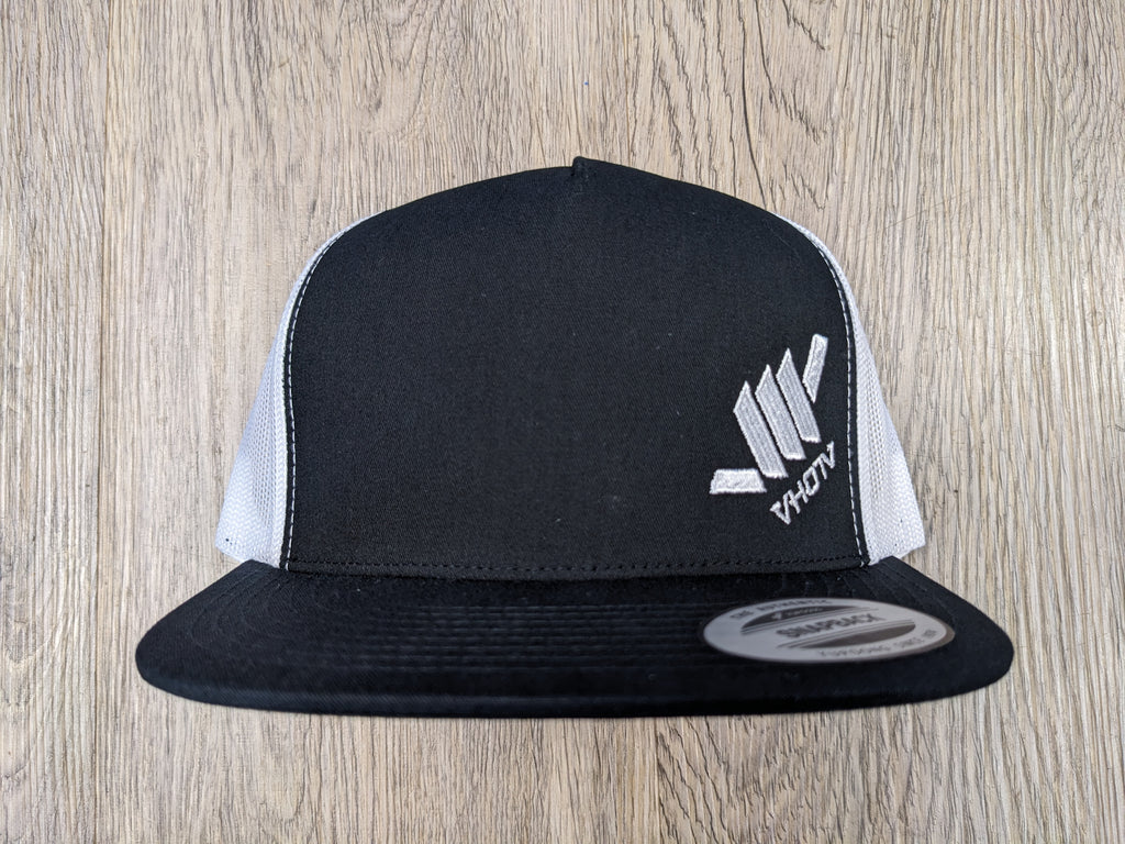 - Diagonal Mini Shaka in White thread on a Black/White, 5-panel cap with buckram front lining, classic mesh back, and quilted comfort sweatband. 3 ½" crown, 8 rows of stitching on flat visor, with matching plastic adjustable strap. Material: 47% Cotton / 25% Polyester/ 28% Nylon.