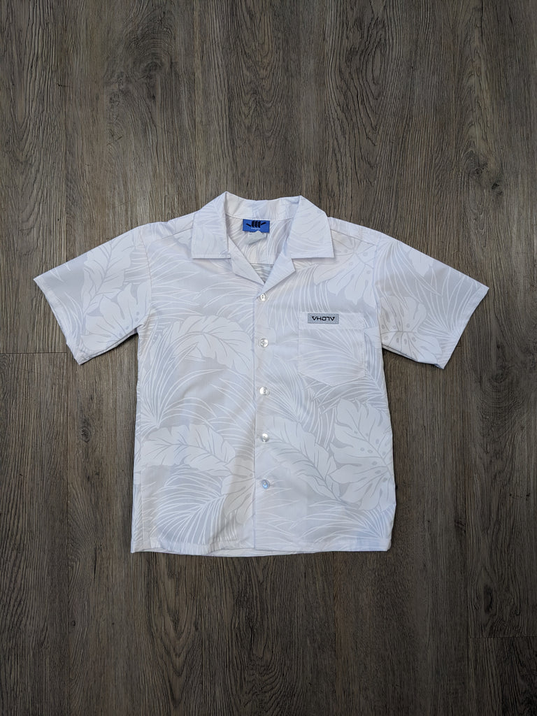 Our "Aloha Floral" series features this classic, all White, Cotton/Poly (65%/35%) casual/dress button down Keiki (Children's) "Aloha" shirt with a matching White Floral pattern pocket, straight hem with side vents/splits, back center box pleat, and is proudly made right here in Hawaii. - SIZING DIFFERS FROM BLACK KEIKI VERSION (LARGER).