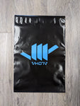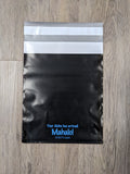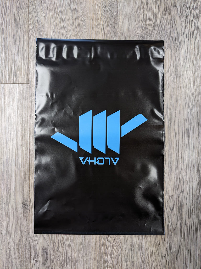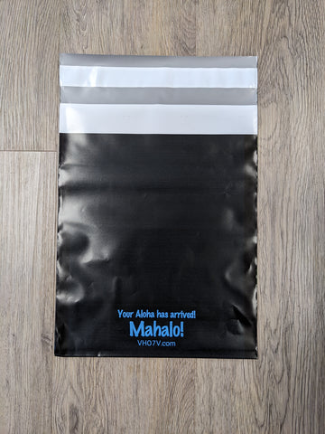 13 x 10 Black, Lightweight, Flexible, Custom Poly Bag with Light Blue Shaka Logo on front and "Your Aloha has arrived! Mahalo!" message on back. Ideal for shipping apparel, t-shirts and non-fragile items or to just "wrap" gifts for your recipients. Full-color with sealable enclosure.