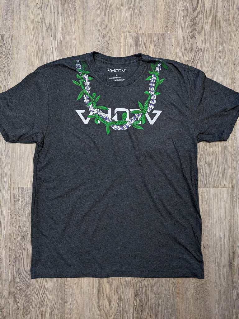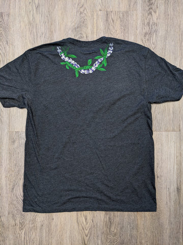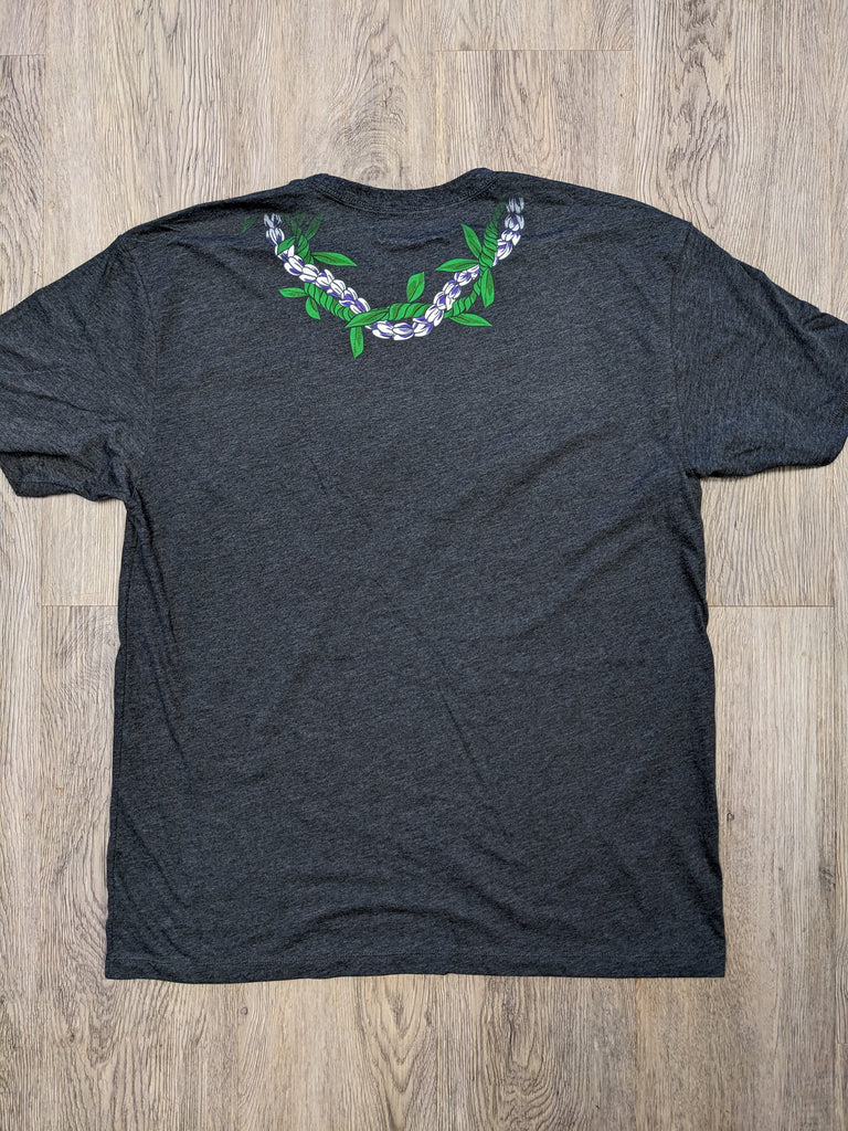 Purple Crown Flower & Ti Leaf "Lei" design printed around the neck on both front and back on a soft, Charcoal Heather, 52% Cotton / 48% Polyester Crew T-Shirt. Perfect for fans of Hula, Hawaiian Culture, plants, Hawaii and more! 4.3 oz,, 30 singles. Premium fabric, neck ribbing, side seamed, shoulder to shoulder tape, and double-needle hems. Also comes in Tan.