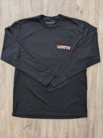Japan inspired design that includes Tsuru (Cranes), a Seigaiha pattern, and a Hokusai inspired wave pattern, all on the back of a soft, Black, 52% Cotton 48% Polyester Crew T-Shirt. 4.3 oz,, 30 singles. Premium fabric, neck ribbing, side seamed, shoulder to shoulder tape, and double-needle hems. Also comes in short sleeve.