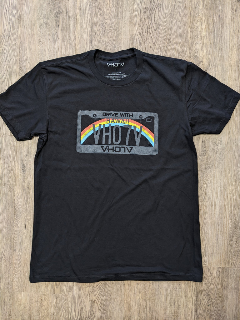 With Hawaii's iconic rainbow design license plate soon coming to an end, we thought, "what better time to pay homage to it than to immortalize it on one of our super soft T-shirts?" Printed on our buttery soft, Black, 52% Cotton 48% Polyester Crew T-Shirt, you'll be sure to turn heads with this eye-catching design! 4.3 oz, 30 singles. Premium fabric, neck ribbing, side seamed, shoulder to shoulder tape, and double-needle hems. Also comes in Stone Heather and Light Blue.