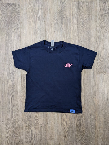 New "Bloom" design on the back of a Navy Keiki T-Shirt with small Shaka icon on front left chest. 6 oz. (10 oz Canada) 100% cotton tubular jersey. Classic Short Sleeve (Regular Fit) Tee, double-needle bottom hem and sleeves, with shoulder-to-shoulder tape. Pre-shrunk to minimize shrinkage.