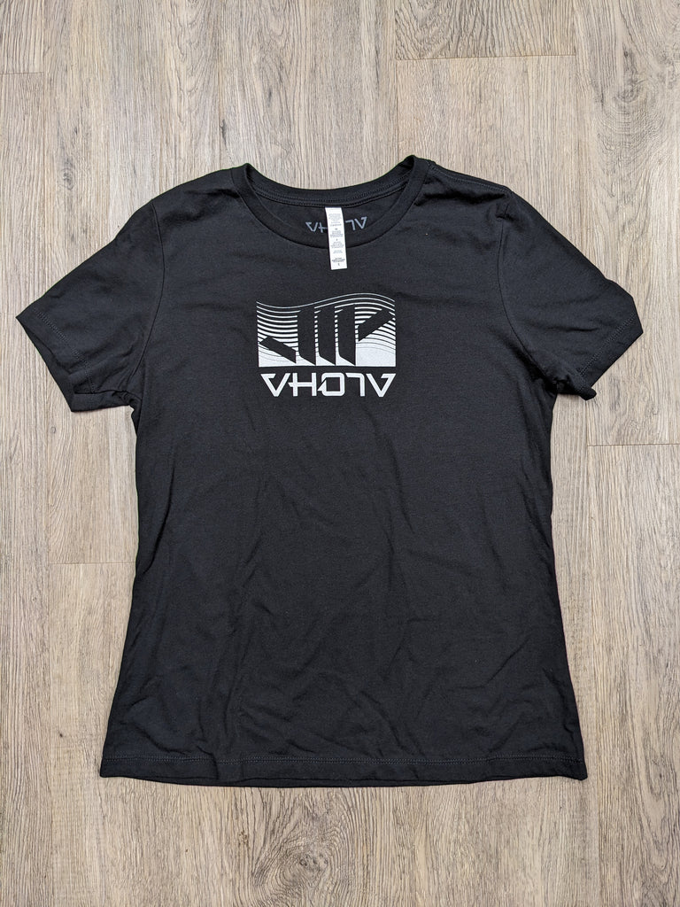 Our classic "Shaka Wave" design on a Lightweight and super soft Black ladies Tee. Features a crew neck and short sleeves and made from the extremely popular Heather CVC fabric. Sideseamed. Relaxed fit. Heathered texture. 52% Airlume combed and ring-spun cotton, 48% poly, 32 single 4.2 oz.