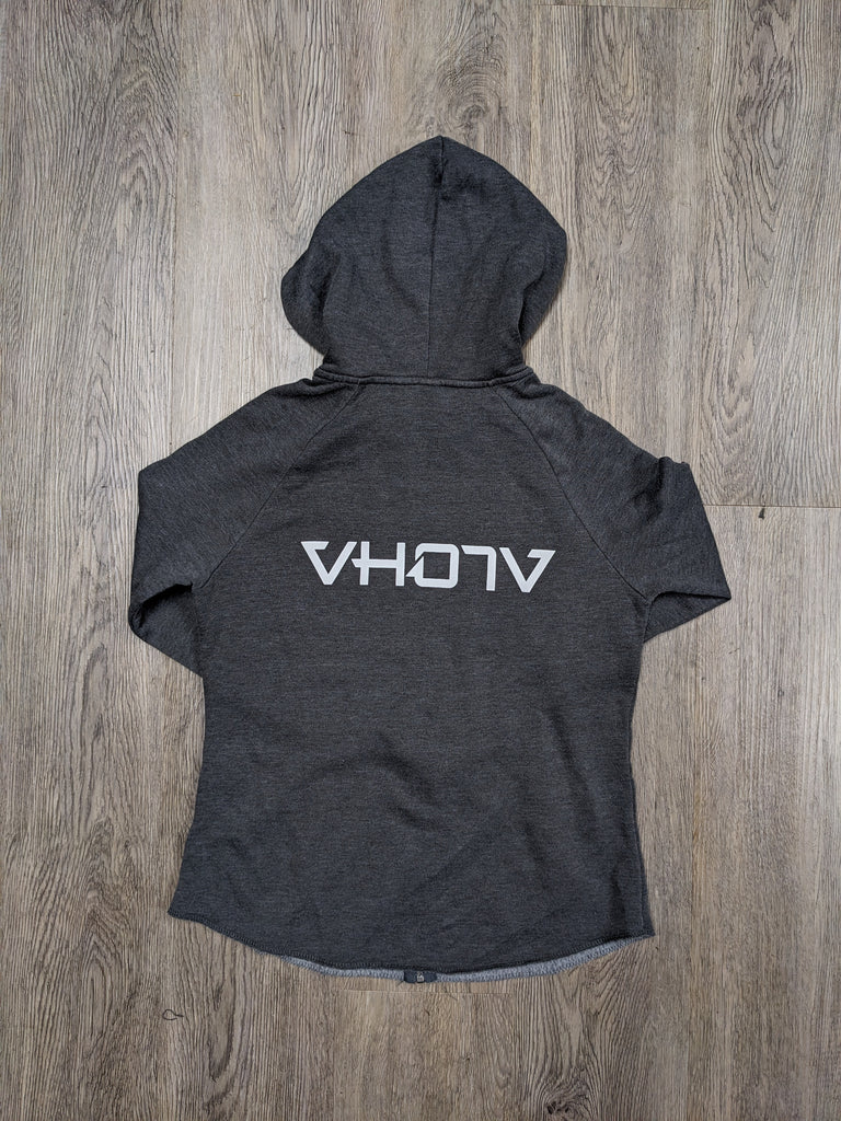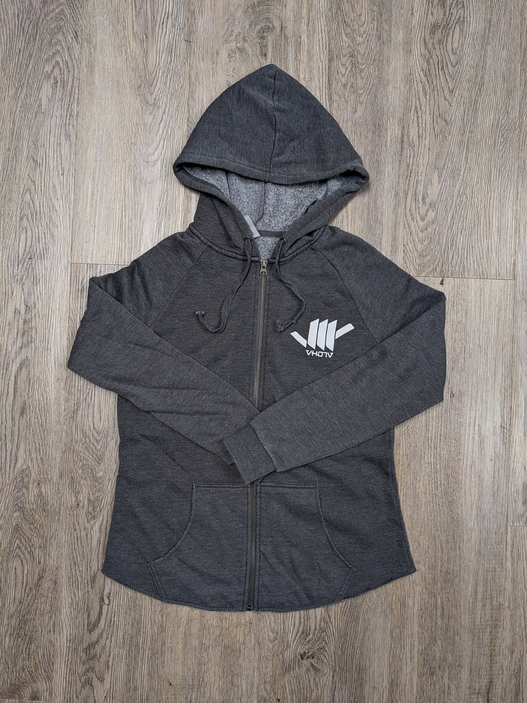 Our Ladies Wave Wash Zip Hoodie is super soft, casual, and extremely comfortable. Comes in a Dark Gray (Shadow) color with white print. The unique fabric is Single dyed and heavily garment washed to bring you a one of a kind look, feel, and color tone. The beautiful color palette, Modern Silhouette, and soft hand feel makes this style a standout. Premium ring-spun cotton is used to achieve a smooth and stable fabric. Completed with quality construction, raglan sleeves, antique exposed nickel zipper, and sewn eyelets.