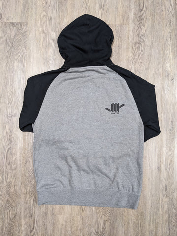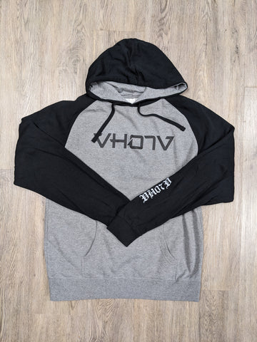Uniquely comfortable, two-tone raglan hooded pullover in Heather Gray/Black colorway with Black Logo on chest, Shaka on back right ribcage, and Old English VH07V on left forearm. Premium ring-spun cotton, completed with a jersey lined hood, nickel eyelets, flat drawcord and 1x1 ribbing at cuffs and waistband. 7.0 oz (230 gm) 55% cotton/45% polyester blend fleece, ring spun cotton, raglan sleeves, jersey lined hood, split stitch double needle sewing, front pouch pocket, twill neck tape, 1x1 ribbing at cuffs and waistband, nickel eyelets, slim fit.